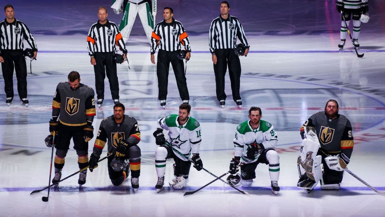 Dallas stars' jason dickinson (18), tyler seguin (91) and vegas golden knights' ryan reaves (75) and goalie robin lehner (90) take a knee for black lives matter prior to an nhl hockey playoff game.